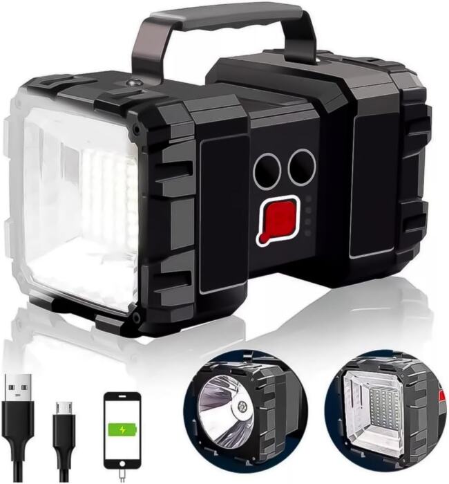 A lanterna tem potência de 40W, sete modos de luz, serve para carregar aparelho celular via cabo e tem bateria com duração de uso direto de até 25 horas. Os modos de iluminação são ajustáveis para foco aberto ou foco fechado. É leve e resistente à água. Clique para comprar.