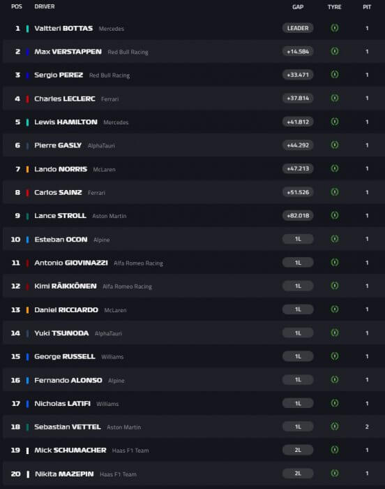 Bottas tocou até o final e ficou com a vitória, com direito a melhor volta e ponto extra. A Red Bull colocou dois pilotos no pódio, com Verstappen em segundo e Pérez em terceiro. Todos os pilotos terminaram a prova.