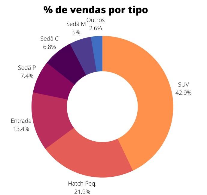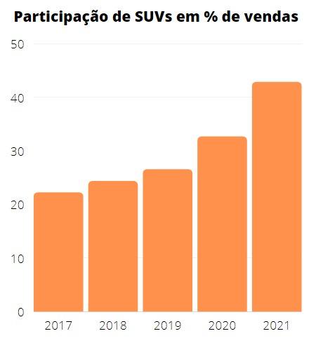Hoje, a cada 100 vendas de veículos no Brasil, 43 são de SUVs e apenas 22, de hatches pequenos. Os modelos de entrada, que figuravam bem até poucos anos atrás, agora são apenas 13% do mercado.