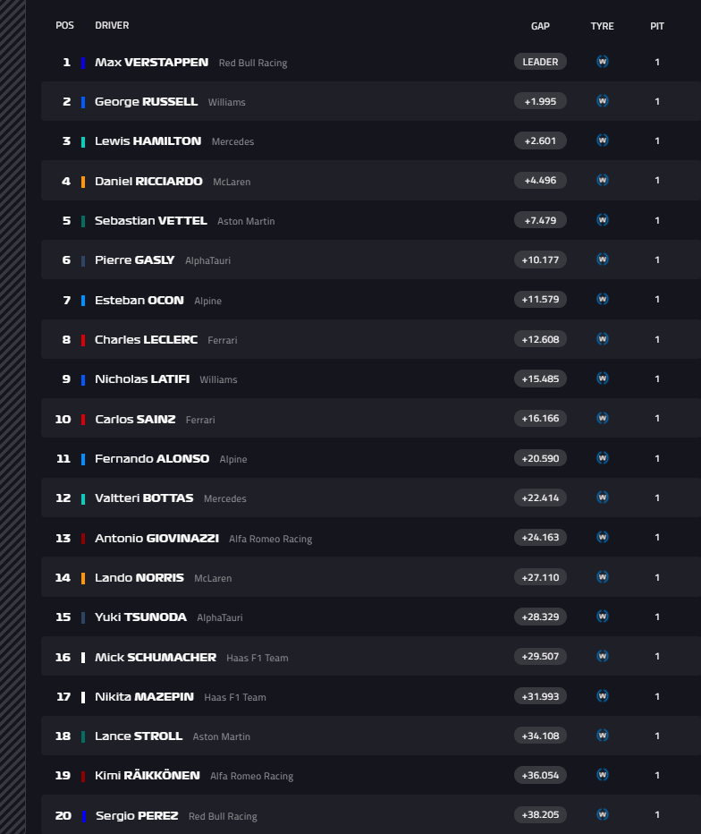 A corrida mais sem graça da história da Fórmula 1. Assim ficará marcado para sempre o GP da Bélgica 2021. A forte chuva impediu qualquer disputa e com apenas 3 voltas, todas atrás do safety car, Max Verstappen foi declarado vencedor. George Russel, da Williams, e Lewis Hamilton, da Mercedes, completaram o pódio, mantendo as posições conquistadas no sábado, durante a classificação.