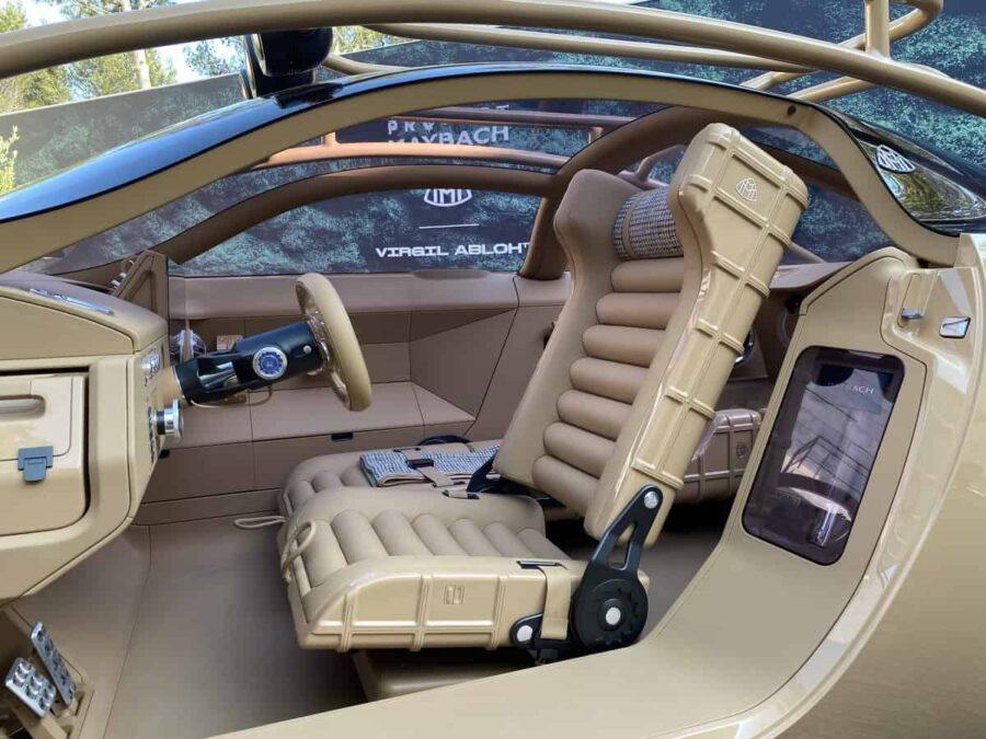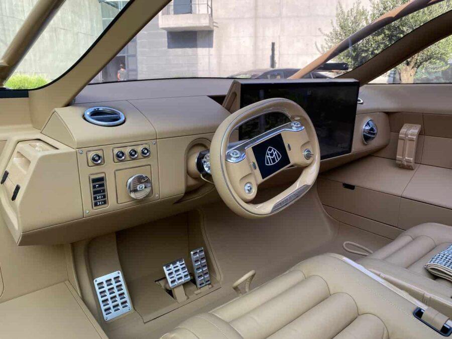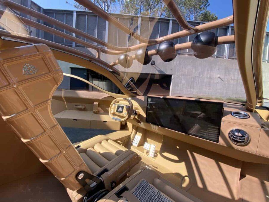 O teto é inteiro de vidro, fazendo com que os ocupantes vejam a gaiola metálica que caracteriza o off-road, além de 4 dos 8 faróis extras.
