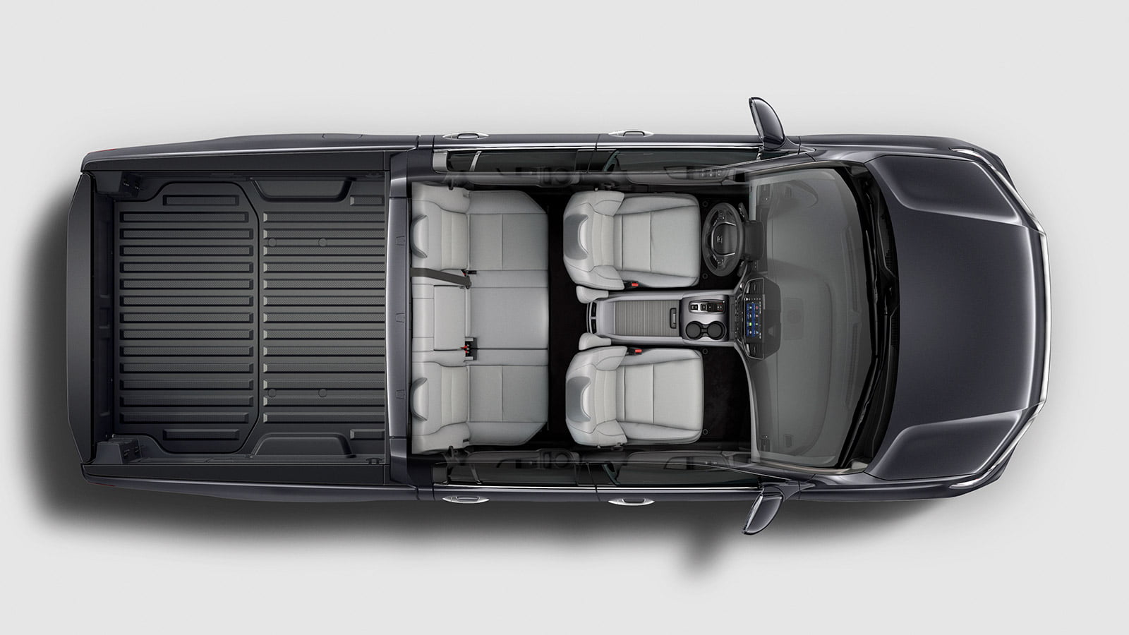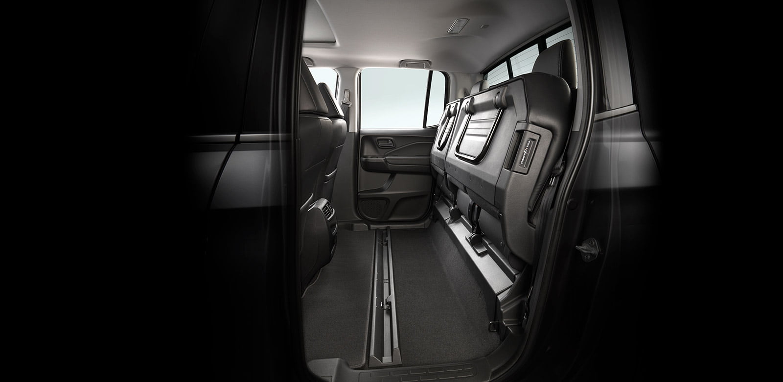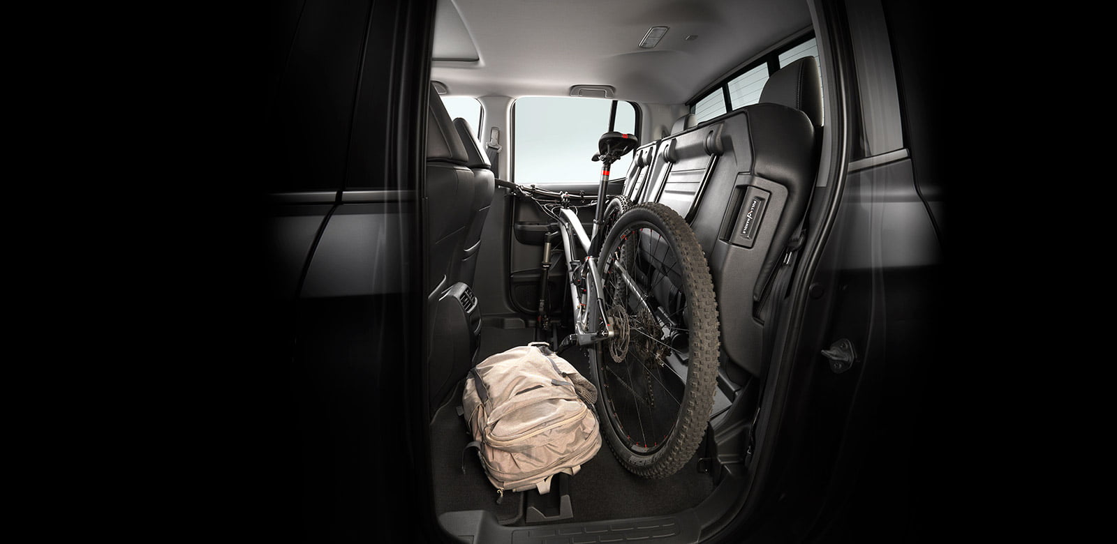 A primeira vista, aliás, a Ridgeline parece mais com a futura picape Maverick, da Ford. Por dentro, um cockpit que se assemelha aos veículos da marca já vendidos por aqui. Na fileira de bancos traseiros uma solução interessante: o assento levanta e é possível carregar ali mais equipamentos, como uma bicicleta. Veja abaixo:
