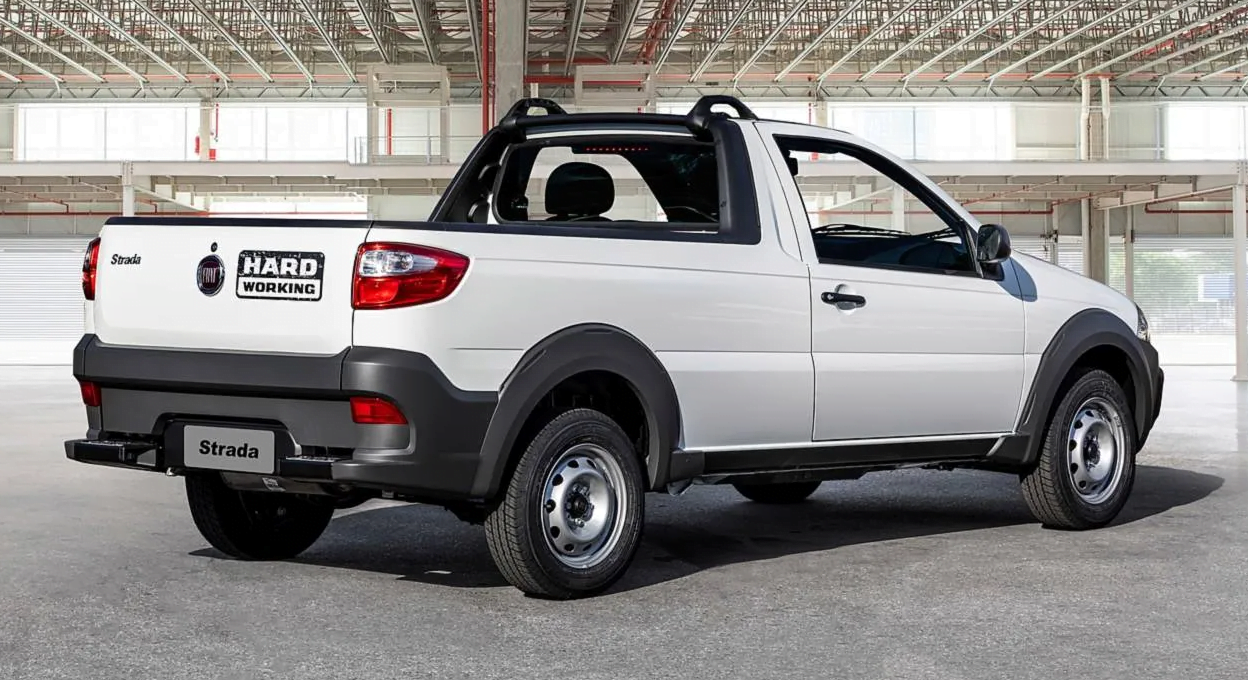A última versão disponível da Strada da primeira geração: 1.4 Hard Working com Cabine Simples (Divulgação/Fiat)Com o preço tabelado em R$ 65.490, a antiga Hard Working trazia de série Ar condicionado, direção hidráulica, volante com regulagem de altura, protetor de caçamba e preparação de som. O motor era o 1.4 Fire EVO com até 88cv no etanol e capacidade de carga de 705kg de carga util e 1.220 litros de volume na caçamba da cabine simples.