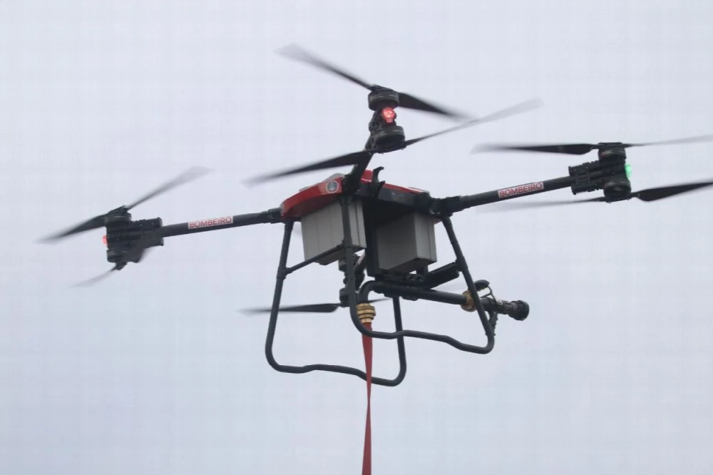O drone bombeiro pode voar a até 30 metros de altura, o equivalente a um prédio de 10 andares e o jato d'água pode atingir 30 metros de distância. Carrega até 100 quilos, o suficiente para aguentar o peso e o fluxo da mangueira acoplada.