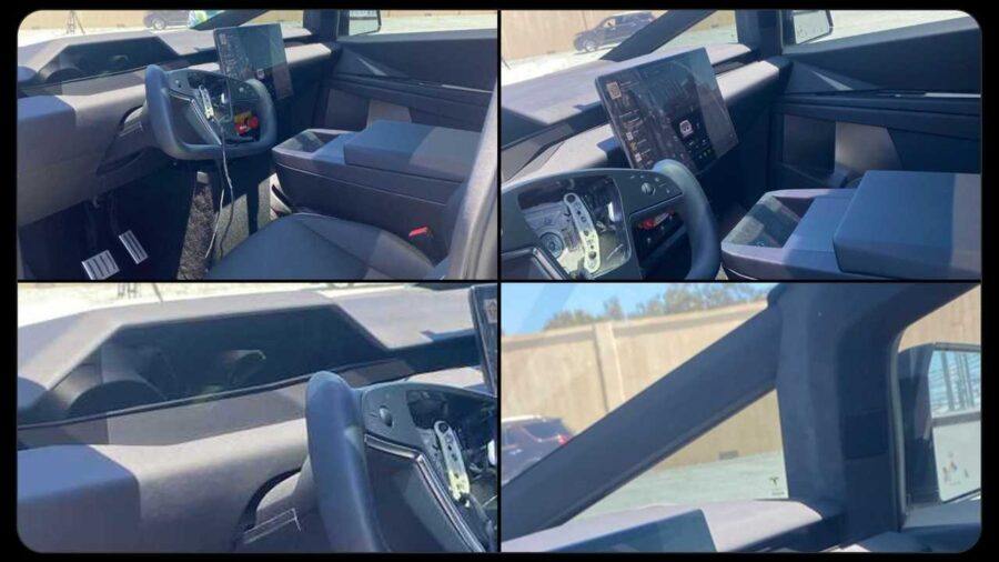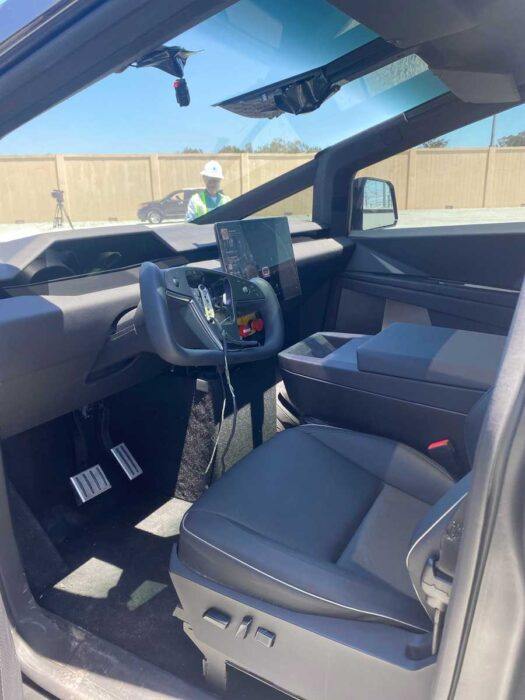 A picape da Tesla fotografada ainda é um protótipo, mas sinaliza mudanças em relação ao que a marca já vinha apresentando anteriormente: atrás do volante está um painel que não aparecida no desenho original. Especulava-se que a Tesla concentraria todos os indicadores do carro na tela central.