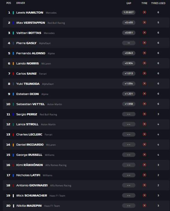 Hamilton, que já era o mais rápido até sua última tentativa, conseguiu uma vantagem de 0,455 segundo sobre o segundo colocado, justamente o seu rival na briga pelo título da temporada. Max Verstappen larga em segundo e Valteri Bottas será o terceiro no grid.