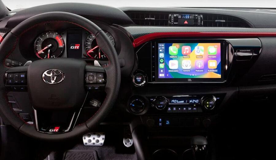 Interior da picape Toyota (foto: Toyota/ divulgação)Dentro a picape ganhou detalhes que já são familiares para quem conhece outros produtos da linha Gazoo, como o Toyota Corolla Cross. Visual escurecido ao estilo fibra de carbono. Central multimídia de nove polegadas, sistema de som JBL com seis falantes, dois twitters e um subwoofer.