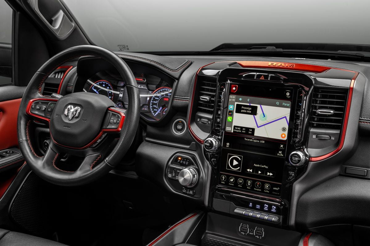 Central multimídia de 12 polegadas fica na vertical - foto: divulgação/FCAA picape tem uma central multimídia de 12 polegadas, inserida verticalmente, sendo possível ver, ao mesmo tempo o mapa de navegação, o display de músicas e os comandos digitais de ar condicionado. O sistema é compatível com Apple CarPlay e Android Auto.