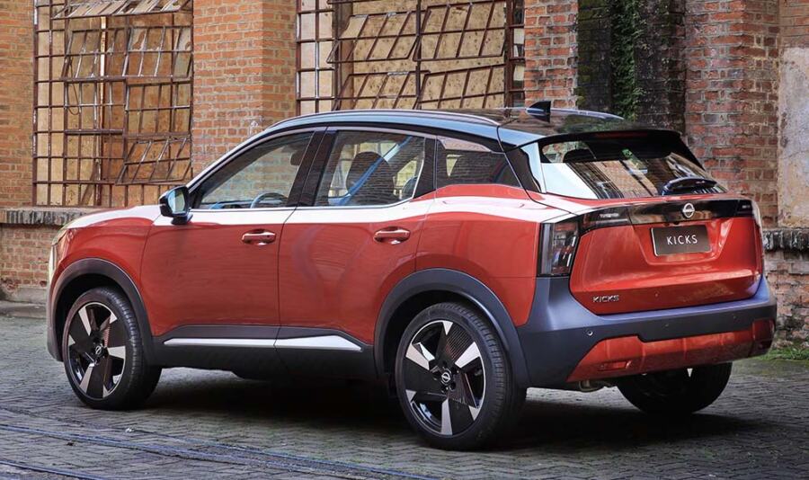 O Kicks segue sendo produzido em Resende, no interior do Rio de Janeiro. A carroceria agora está 5 centímetros maior que o modelo antigo (4,36m). Na largura são 4 centímetros (1,80m). O porta-malas ficou maior também. Saltou de 432 para 470 litros. É um espaço um pouco maior que seus concorrentes. O Creta, por exemplo, tem capacidade de 422 litros.