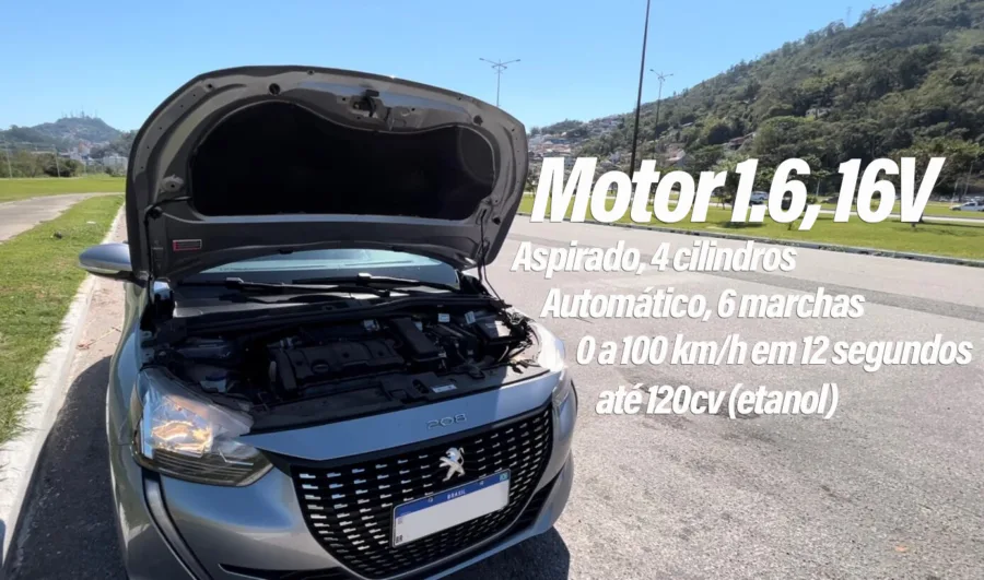 Esse motor tem 16 válvulas e câmbio automático. Não existe versão manual neste 208 desde que foi lançada a versão com esse design. O motor desenvolve até 120cv de potência. O torque é de 15,7 kgfm. É ruim de potência? Não é ruim, mas demora um pouco para a retomada. Considerando que eu rodei por 5 dias com o carro com pouca bagagem e apenas duas pessoas dentro, imagine que mais pesado a situação é ficar mais lento.
