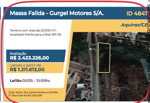 Uma avaliação do terreno feita por um corretor da cidade cearense e que consta no processo aponta que o valor de mercado do espaço é R$ 700 mil e que a expectativa é que a venda seja por valor menor que esse. Há um rio que passa pelo terreno e a rodovia a sua frente. O corretor alega nesta avaliação que o terreno já não tem a mesma serventia de anos atrás porque houve mudanças na lei ambiental e nas normas do DNIT, o que torna a área utilizável bem menor do que há 30 anos.