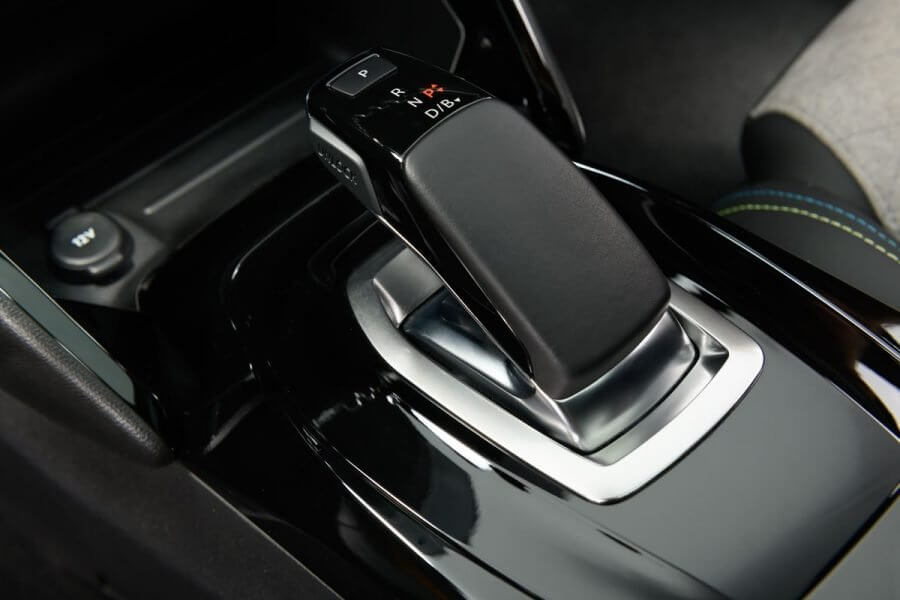 O câmbio tipo joystick tem cinco modos de seleção: P (Park), D (Drive), N (Neutro), R (Ré) e B Mode. Este último ajuda a regenerar bateria, otimizando a autonomia do veículo. O condutor pode escolher entre “moderado”, para sensações semelhantes às de um veículo a combustão, e “aumentado”, para uma desaceleração controlada pelo pedal do acelerador.