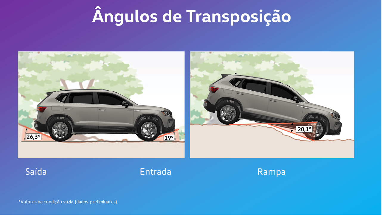 A Volkswagen também divulgou dados sobre os ângulos de transposição. São 19º na entrada, 26,3º na saída e 20,1º em rampa (ilustração abaixo). Isso se deve às medidas de balanço dianteiro (900mm) e traseiro (881mm), este último responsável também pelo tamanho maior de porta-malas.