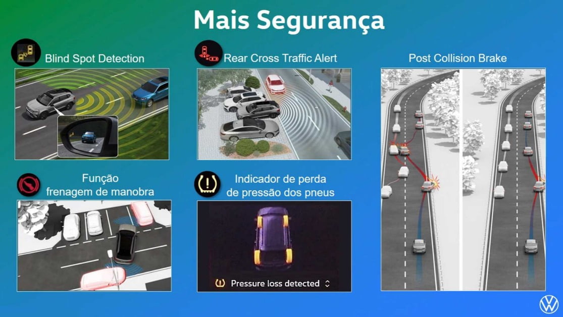 Outra novidade é a frenagem de manobra. Quando o motorista entrar em uma vaga os sensores dianteiros e traseiros freiam o carro automaticamente para evitar pequenas colisões durante a esterção. Para fechar a lista de equipamentos, o Taos terá sistema Kessy por aproximação e teto solar panorâmico.