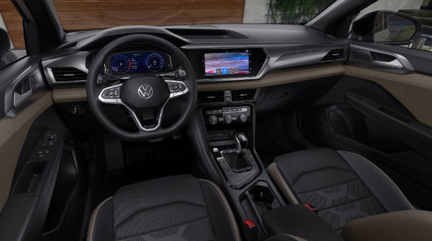 O Taos recebe também o Active Info Display, o painel digital de 10,25 polegadas que oferece a possibilidade de personalizar as informações que são mostradas, de acordo com o gosto do motorista. O modelo também virá com o novo volante da Volkswagen e o novo logotipo da marca, que estrearam no Brasil no Nivus.