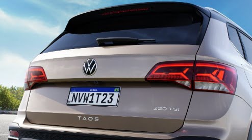 Traseira não manteve estilo do T-Cross e do Nivus - Foto: divulgação/VWO Taos virá equipado com o motor 1.4 250 TSI, o mesmo que equipa versões do T-Cross, Tiguan, Virtus, Polo e Jetta. Produzido na fábrica da VW em São Carlos, interior de SP.